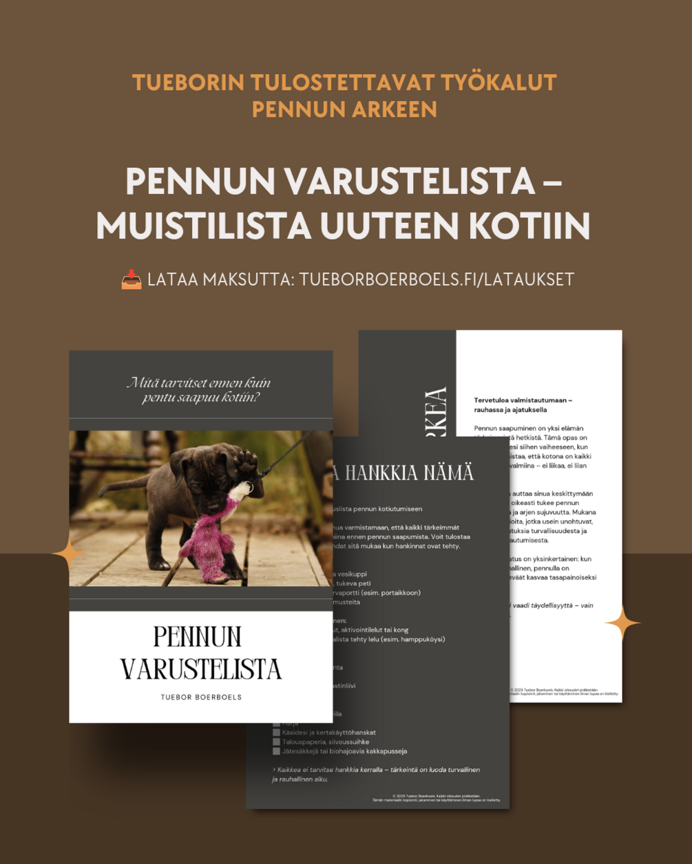 Lataa käytännöllinen ja selkeä 12-sivuinen lista, joka auttaa sinua valmistautumaan pennun saapumiseen ilman turhia ostoksia tai stressiä. Mukana myös muistilista helposti unohtuvista asioista sekä pennulle vaarallisista paikoista. Sopii erityisesti suurille roduille, kuten boerboeleille – mutta hyödyllinen kaikille!