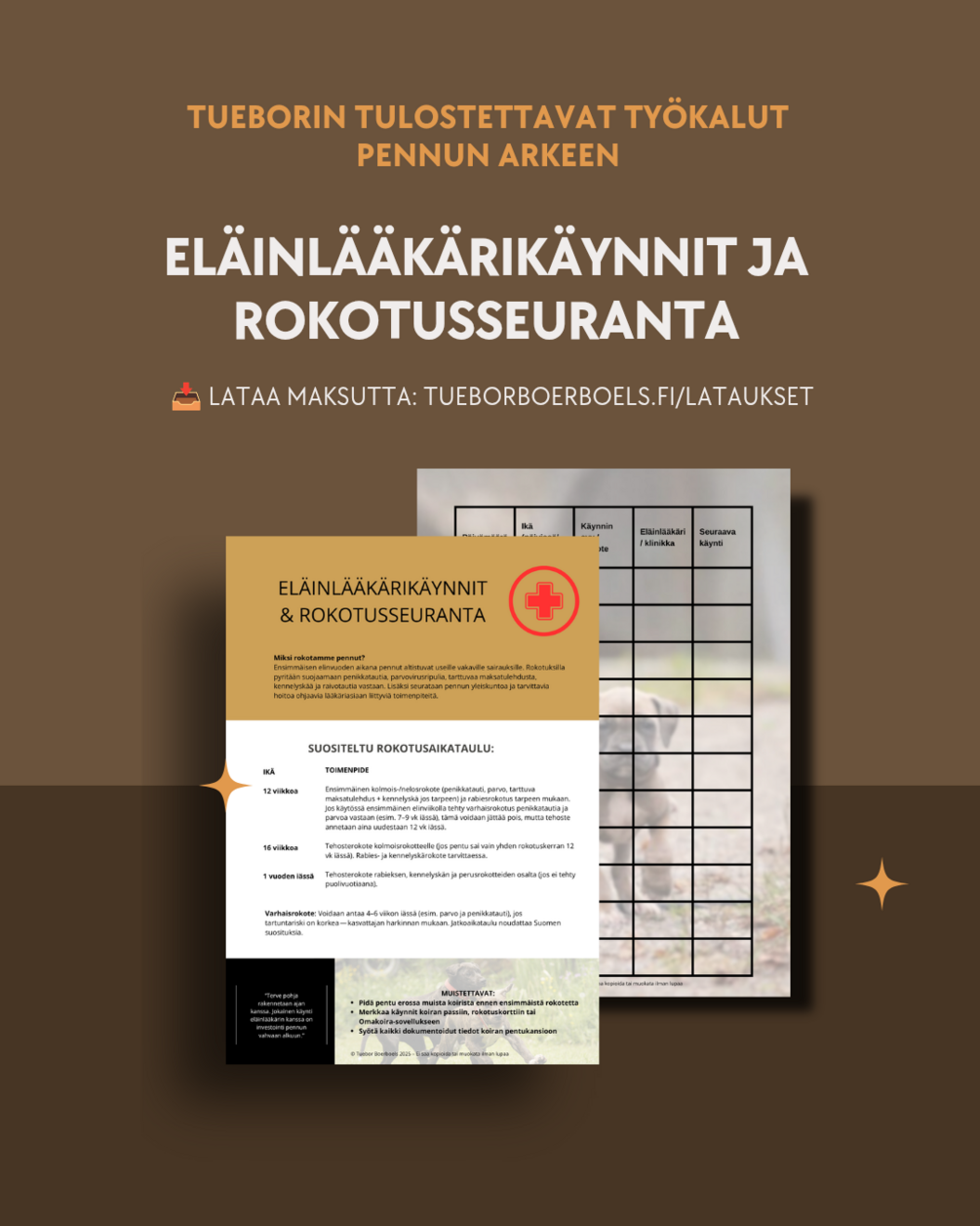 Saat tulostettavan lomakkeen, jossa voit seurata eläinlääkärikäyntejä, rokotuksia ja muita hoitotoimenpiteitä.
