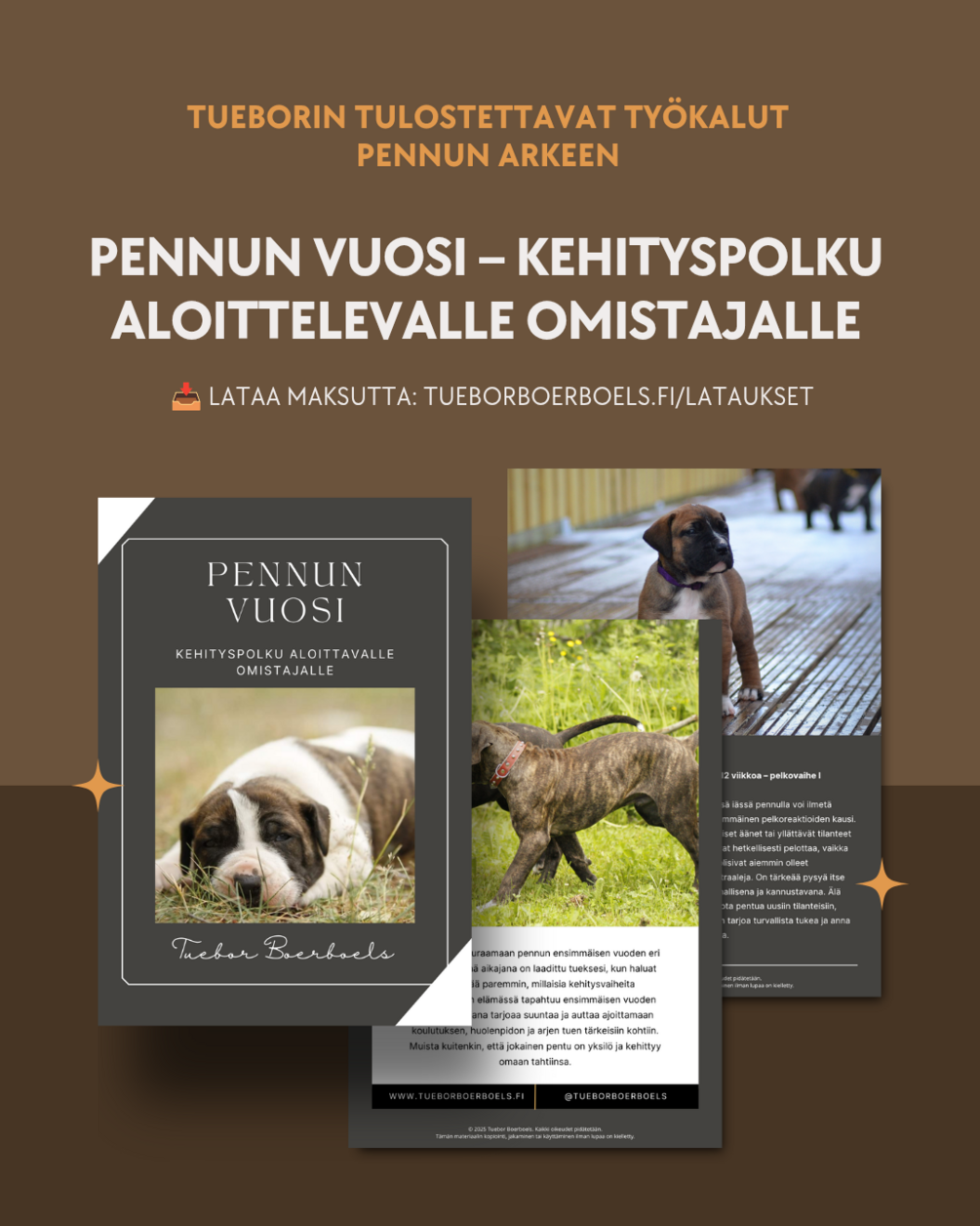 Kahdeksansivuinen tulostettava kokonaisuus, joka seuraa pennun kehitystä ensimmäisen elinvuoden ajan.